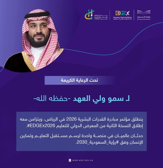 ​சவுதி அரேபியாவின் மகுட இளவரசரின் நற்பாதுகாப்புடன் – எதிர்வரும் மே மாதம் ரியாத்தில் “மனித ஆற்றல் முன்முயற்சி” (Human Capability Initiative) மாநாடு தொடங்கவுள்ளது. இதனுடன் இணைந்து, சர்வதேச கல்வி கண்காட்சியின் இரண்டாவது பதிப்பான #EDGEx2026 நிகழ்வும் நடைபெறவுள்ளது.
